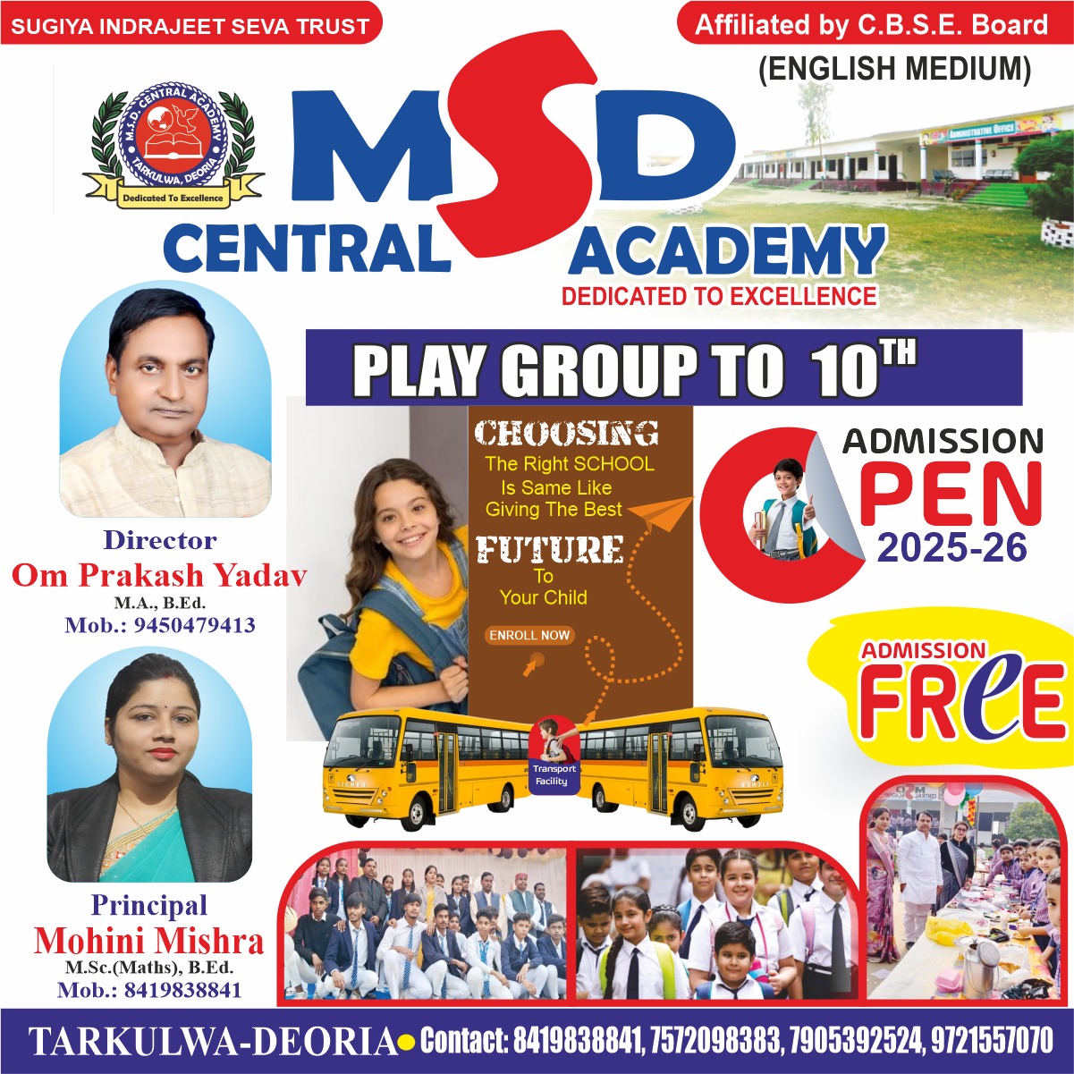 The MSD Centra Academy (MSD) is an English Medium School. It is running on the pattern of central board of secondry eduction, New Delhi. It has impreessive building, equipped with modern amenities,electricity....
